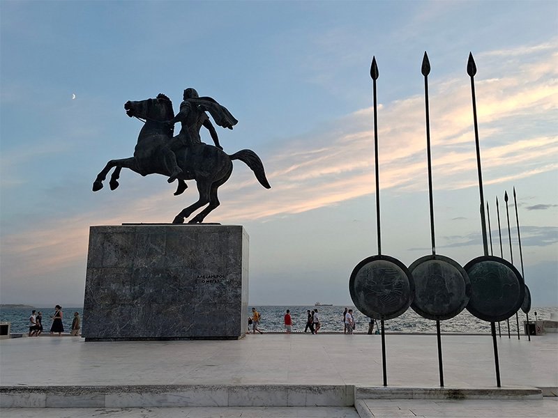 The monument features a large bronze statue of Alexander the Great mounted on his legendary horse, Bucephalus, symbolizing strength, leadership, and historical significance. Surrounding the statue are Macedonian shields and spears arranged in an artistic formation, adding depth to the visual storytelling. The open plaza offers wide seating areas, a long promenade, and views of the sea, making it a peaceful place to pause and enjoy the city’s coastal atmosphere.